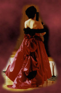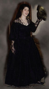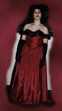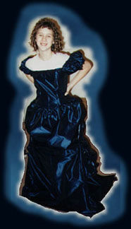 | Back view of "Bad Blood" dress. | Katie as Claudia from Interview With The Vampire. The dress isn't quite finished in these photos -- the zipper hadn't been put in, and Katie is holding the dress on! One of these days I'll get hold of one of the professional photos from the con. | This was an apprenticeship project for Katie; she did about half of the actual construction, and won a special workmanship award at Marcon 1995 -- the only one I've ever seen awarded to a child. |