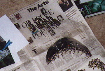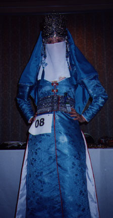 | Shannon performs at our wedding reception in a dress I copied from Jean Butler's costume for the original version of Riverdance. | Headdress for "CrankyMongolianSam" (copy of Sam's costume from the Stargate SG-1 episode "Emancipation") as a work in progress. | More headdress in progress. |