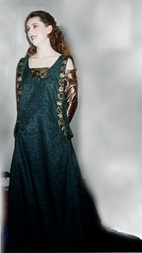 | "The Red Shoes", TorontoTrek 1994. This was a reworking of the banshee dress -- it used to have a long tattered train, and I got tired of leaving a snail trail of acetate fibers wherever I went! :-) Inspired by the classic film with Moira Shearer, and also Kate Bush's The Line, The Cross and The Curve. | My design for the "Rose-Gold Witch" Morgause from Mary Stewart's Merlin novels. Visions 1997. | Lizbet as Buffy the Vampire Slayer in "Prophecy Girl" (season 1 finale). MediaWest*Con 1998. |