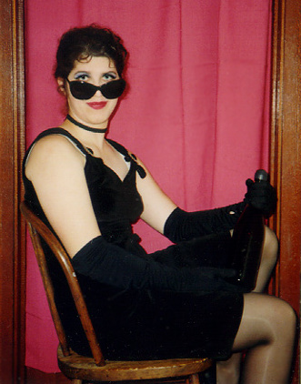 | Hotel room can-can with Jennie and Amy. | Dressed to kill at the Masquerade at Dead of Winter Con, 1995. Amy, Dawn, Karen(?), me. | Chris gets a little too into running a DC Heroes game at Origins 2000 |
