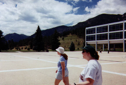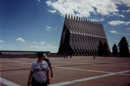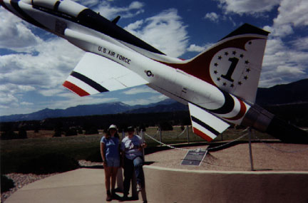 | Jessica and Jennie (among others) pitch in to do Amy's hair for her wedding, October 2000. | Boo and Kiki doing the tourist thing at the Air Force Academy, July 2001. | Boo and Kiki in front of the Thunderbird-on-a-stick. |