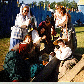 | Jody, Adventure Woman! | Amy in a vampy mode. | Grave considerations in Ohio Renaissance Festival's new churchyard, 1997. Clockwise from top right: me, Amy, unnamed but very tolerant performer, Perri, Maureen, Tina, Betsy. |