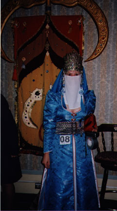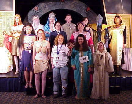 | Ready for the costume contest (camera and emergency repair kit in hand!), in front of one of the banners from Chulak. All the decorations in the main events room were actual set pieces and props lent by Stargate Productions. (Photo by Karen) | The obligatory twirl. (Photo by Var) | The whole motley crew, lookin' good! (Photo by Var) |