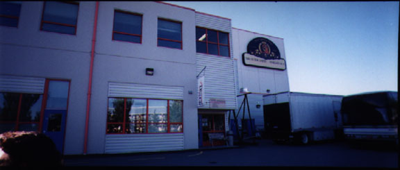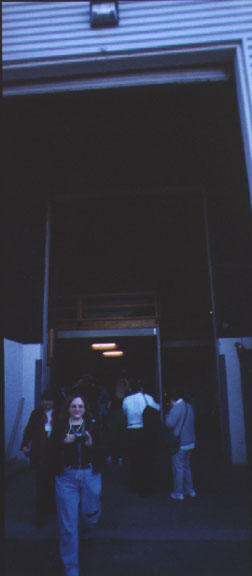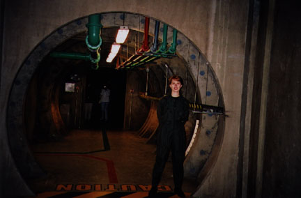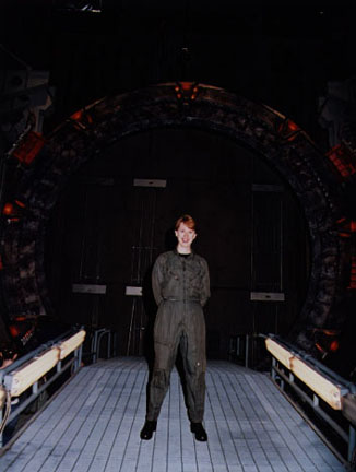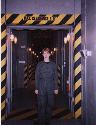 | The Bridge Studios, stage 5 -- the real address of the SGC. | Side corridor; just about to turn right, into the 'gateroom. | On the ramp. I'm wearing Dad's coverall from his first AF tech school in 1970, so he can say his daughter and his clothes have been through the Stargate! ;-) (Photo by Richard) |