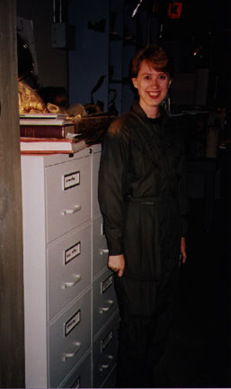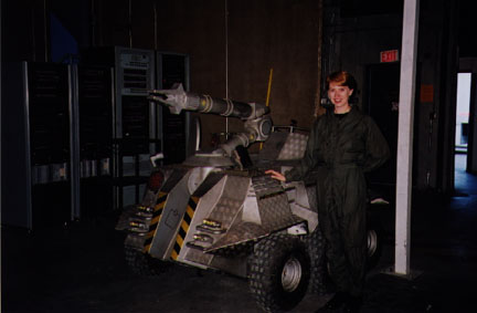 | Around the corner from Daniel's office. Any shot that looks like this is done in this same corridor. | With the MALP (Mobile Analytical Laboratory Probe). (Photo by Karen.) | Linda leaving the soundstage. The light's wrong, but you can just see the bottom edge of the iris on the wooden platform in the doorway. |