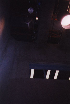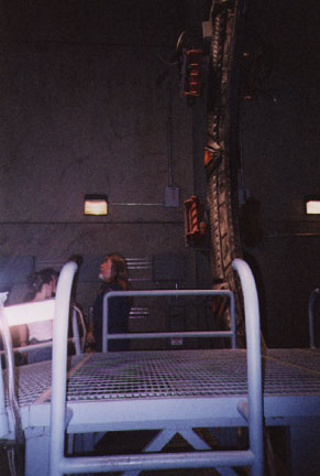 | Side view of the 'gate and ramp. Gaffer Rick Dean explains stuff. | Really Big Gun in the 'gateroom. | 'Gateroom ceiling and corner of back wall with briefing room windows. Really Big Lights. |