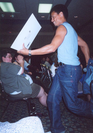 | Jay Acovone takes "running" an auction item around the room literally. (Photo by Dawn) | Peter also favors the athletic approach. (Photo by Dawn) | |