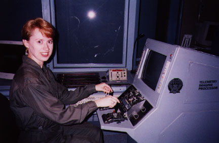 | Round corridor, just outside the 'gateroom (opposite where we came in from the side corridor). (Photo by Karen.) | Level 28: perfume, lingerie, big round thing that takes you to other planets... | At the controls for the MALP or UAV. |