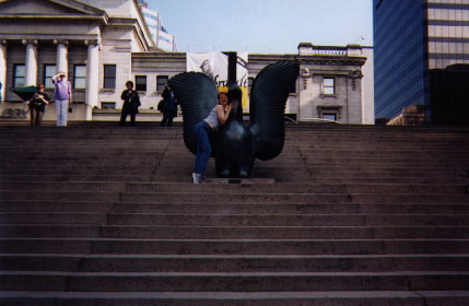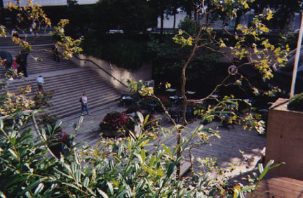 | Vancouver Space Centre. It's coincidence that the fountain sculpture looks like a replicator bug, but I'm suspicious... ;-) The auditorium inside doubled as an Air Force Academy lecture hall in "Prodigy"; McMillan Observatory, on the grounds, was seen in "1969". | Patio of the Old Bailiff Restaurant, from above. Location for the cafe where Sam met Maybourne in "Foothold". | Steps leading from the Vancouver Art Gallery (in background) down to Old Bailiff. This spot doubled for Washington, DC when Sam and Jack were walking to the reception in "Secrets". You can also see the eagle over Sam's shoulder in the cafe scene in "Foothold". |