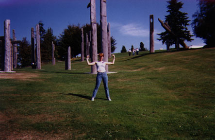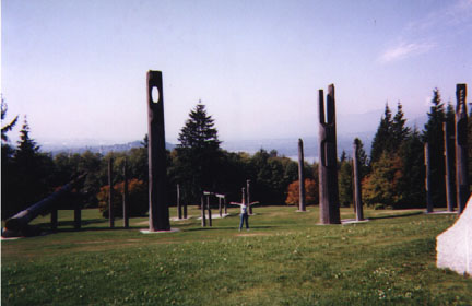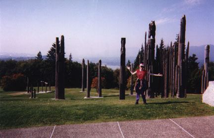| West meets East, new meets old. | Shadow with Ainu totem poles on Burnaby Mountain. Highest point in metro Vancouver. Location for the planet where Apophis was building his new warship in "Upgrades". | I'm shrinking again... Nope, the totem poles are just really, really tall. |