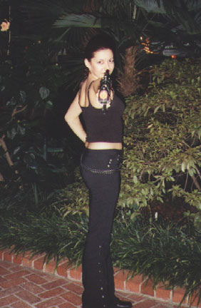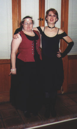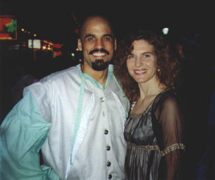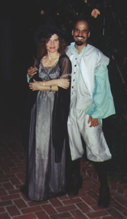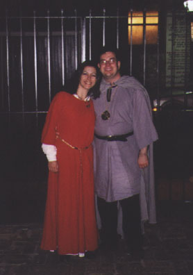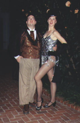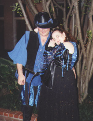| Cavalier Scott (hiding behind his hat, sneaky man!) and Lady Felicia, in the courtyard of Chateau Orleans (a/k/a Laurie's Wonderful Timeshare). | Grace as Aeryn Sun from Farscape. | Jack gets yet more use out of his wedding outfit. I was planning the "Sparkling Diamonds" Satine costume since I first saw Moulin Rouge in May, but didn't actually get to it until two weeks before Halloween. So it got a little simplified. :-) |