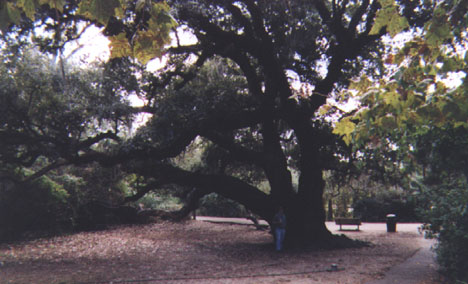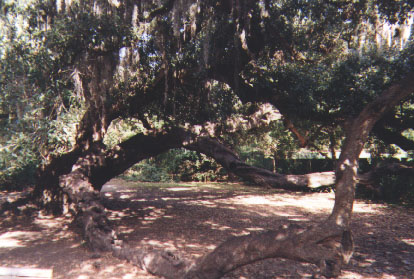 | I am inordinately fascinated by the trees in New Orleans. This one, at the zoo, got partially blown over by a hurricane years ago -- check out the branch in the foreground that's grown along the ground and come back up again! | Same tree, different angle. That blue smudge at the base is Jack. | Dinner at Olivier's on Halloween. Me, Jack, Felicia, Scott, Grace. Awesome food, and plenty of it. And the friendliest service ever. |