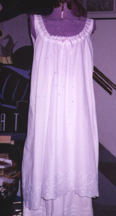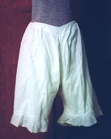The above photos of the dress are taken with it over the undergarments I'll be wearing that day. First to go on are the drawers, which I found on an eBay auction. They are pretty standard Victorian drawers, knee length with a drawstring waist and open crotch. If you're wondering about that last detail, you've never tried to use the ladies' room in all the layers I'm about to continue describing! ;-) |