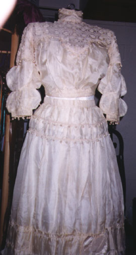 The last layer before the dress is the corset cover, which I forgot to take a picture of because it's actually part of my regular wardrobe and was upstairs in my summer clothes drawer! It's a semi-fitted, button-front cotton camisole that I bought about 1988, and is basically identical in structure to several period examples of corset covers that I've seen. Its main purpose is to protect the dress from the corset hardware...an important purpose when the dress is made of almost-sheer 94-year-old silk! |