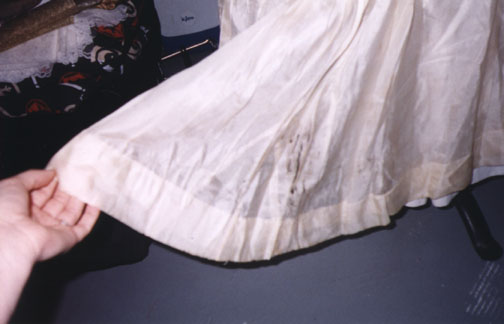 So what does "restore and alter" actually mean? Well, first of all I'll be cleaning it with a special detergent (whose name escapes me at the moment) to hopefully remove some small spots of discoloration. Then I will replace damaged sections, and add an underlayer to the skirt, with an extra flounce (because the original owner of this dress was evidently quite a bit shorter than I am) and a train. The train will be modeled on the illustration above, and on a couple photos I've come across on the Web: Train 1 . |